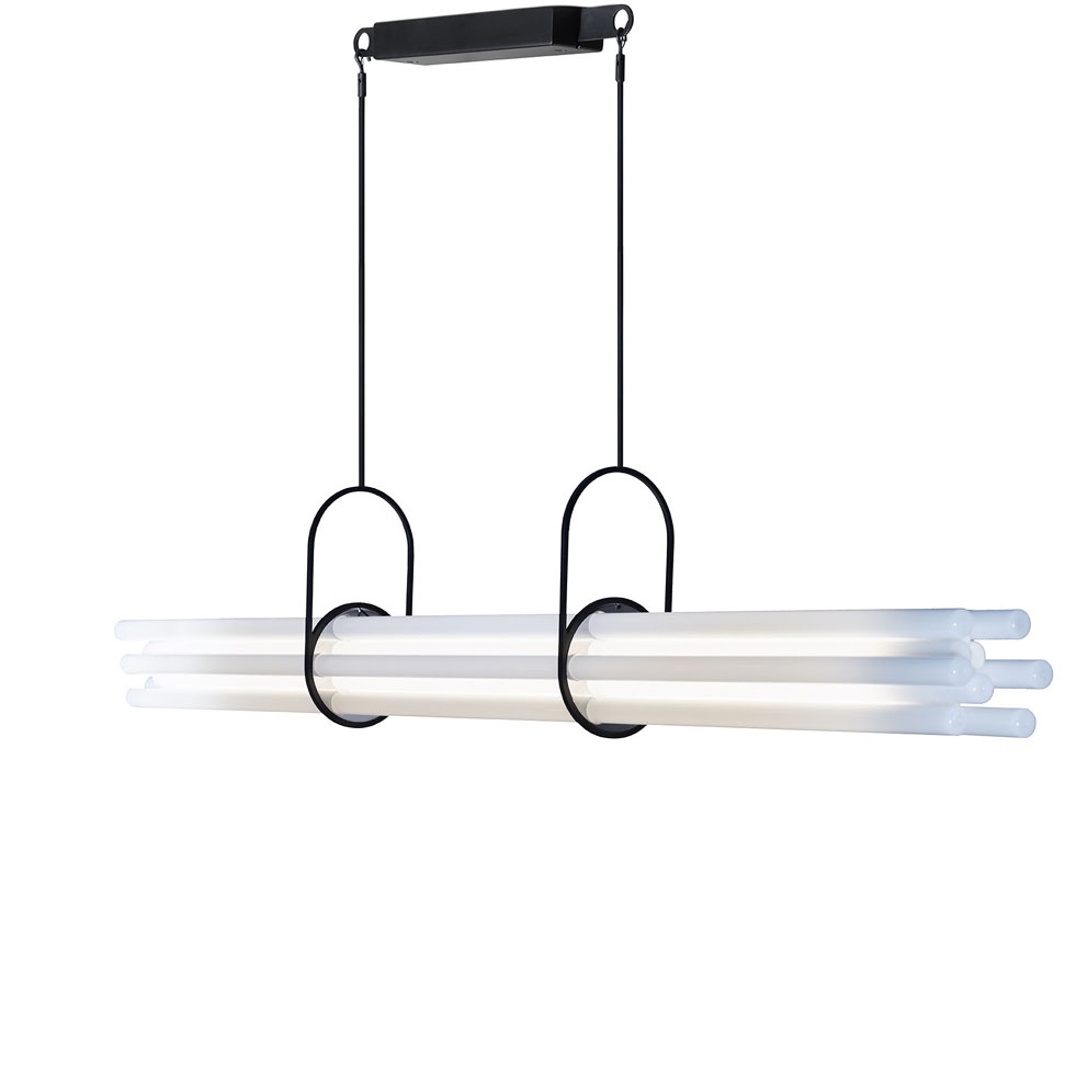 Mit seinem ästhetischen Geschick hat Sebastian Summa eine Aufhängung entworfen, die Gymnastikklammern ähnelt und dazu dient, das Bündel von Röhren perfekt auszubalancieren. Dieses feste Ausrüstungsstück verleiht dem Design einen postindustriellen athletischen Touch - und zeigt eine offensichtliche handwerkliche Meisterleistung an.