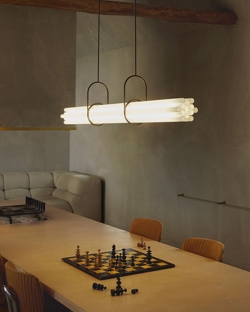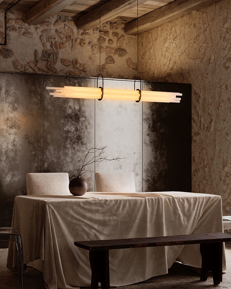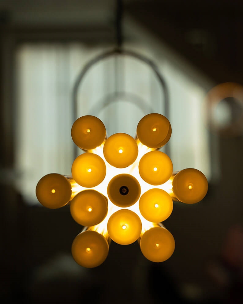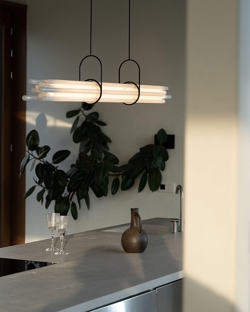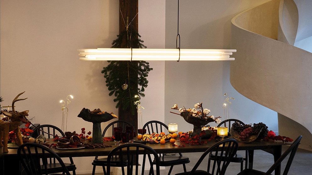 NL12 ist dafür konzipiert, einen großen Esstisch zu beleuchten und besteht aus zwölf Borosilikatglasröhren. Nur eines dieser Röhren fungiert als zentrale Einheit und ist eine Lichtquelle, während die anderen Röhren deren Diffusion durch Brechung und Prisma vermitteln. Die Pendelleuchte hat keine sichtbare Leitung, keine sichtbaren LEDs und keine sichtbare Aluminiumstruktur. NL12 ist ein Himmelsstrahl, der sowohl radikal als auch poetisch ist.