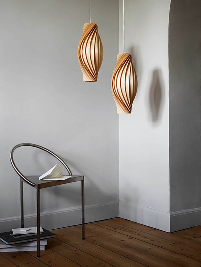 Die Birkenlamellen der Pendelleuchte können im Laufe der Zeit eine schöne Patina entwickeln, wobei sich die Struktur des Holzes leicht verändert. Dies betont die Maserung des Holzes und macht sie etwas heller.