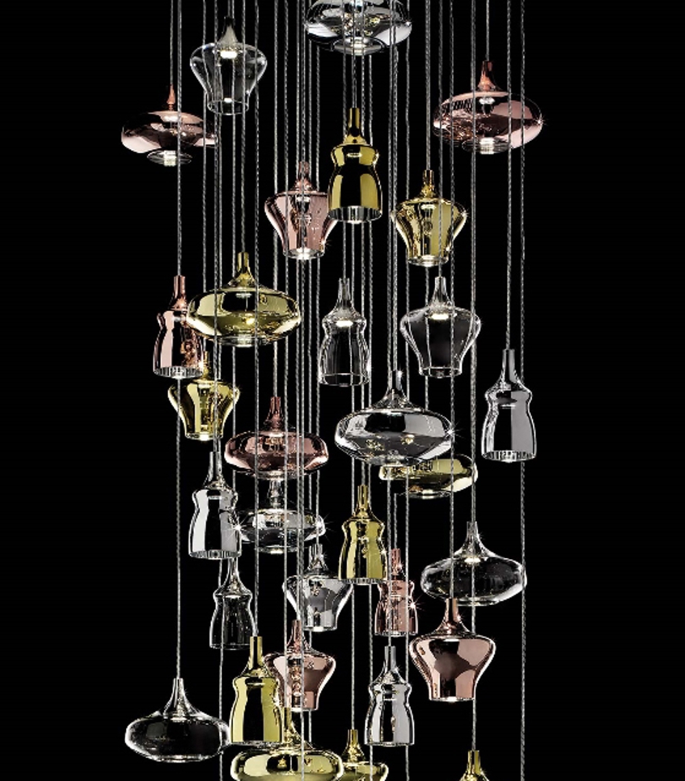 Die Pendelleuchte kann einzeln oder in einer Gruppe von Pendelleuchten aufgehängt werden, entweder gleich oder in verschiedenen Größen und Farben. Die Pendelleuchte ist in vier verschiedenen Farben erhältlich: klar/Kristall, Chrom, Gold & Roségold, und alle Farben ergänzen sich gegenseitig und können daher modellübergreifend gemischt werden.