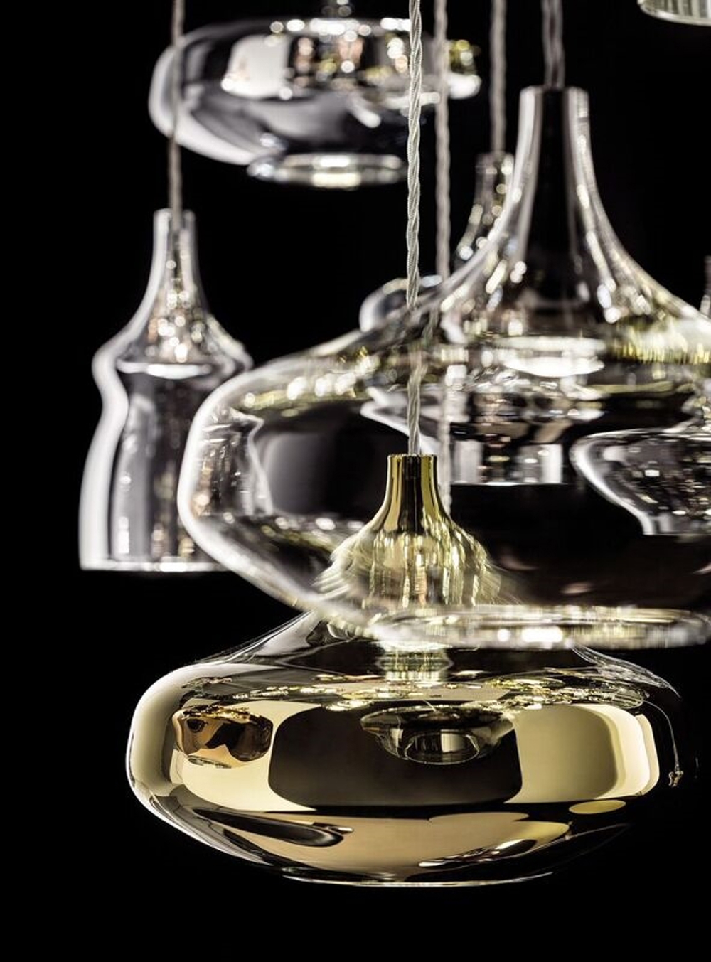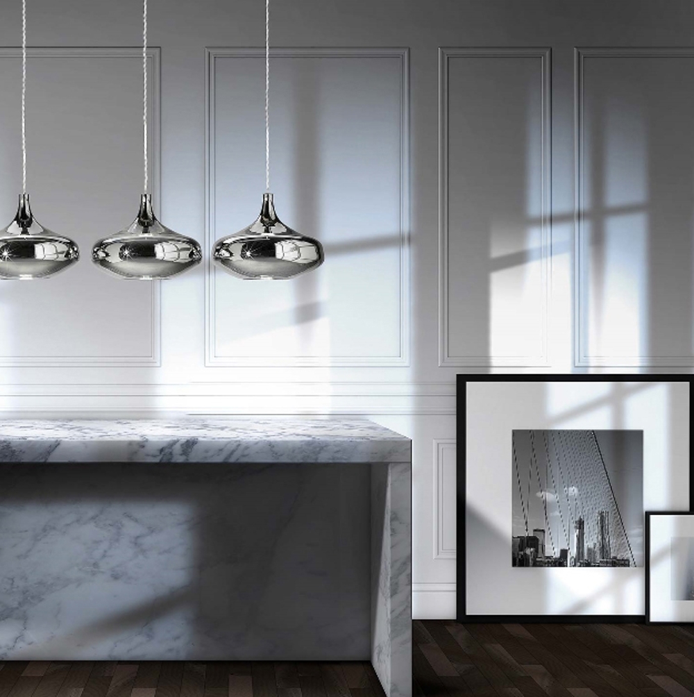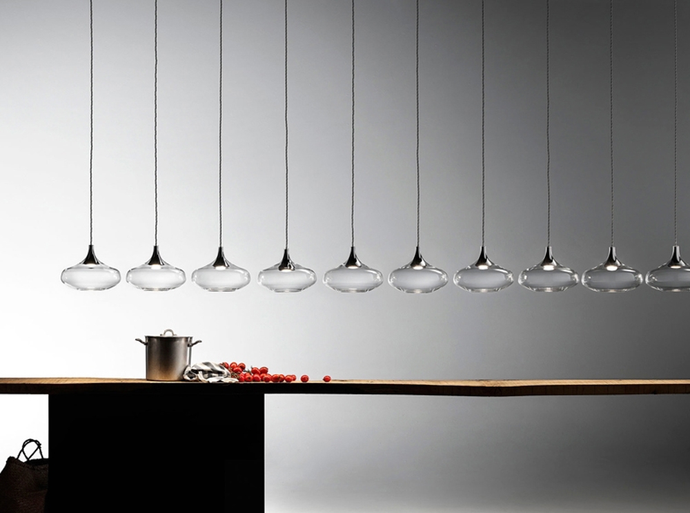 Die Pendelleuchte kann einzeln oder in einer Gruppe von Pendelleuchten aufgehängt werden, entweder gleich oder in verschiedenen Größen und Farben. Die Pendelleuchte ist in vier verschiedenen Farben erhältlich: klar/Kristall, Chrom, Gold & Roségold, und alle Farben ergänzen sich gegenseitig und können daher modellübergreifend gemischt werden.