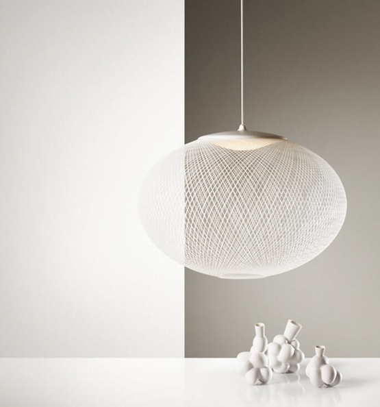 NR2 ist als Pendelleuchte und Stehleuchte in Schwarz oder Weiß erhältlich.