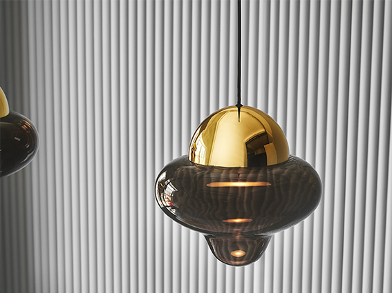 Die Nutty Pendelleuchte ist mit klarem, braunem und rauchfarbenem Glas erhältlich, mit entweder schwarzer, goldfarbener oder chromfarbener Oberseite, sodass es eine Lampe für jede Art von Einrichtung gibt.