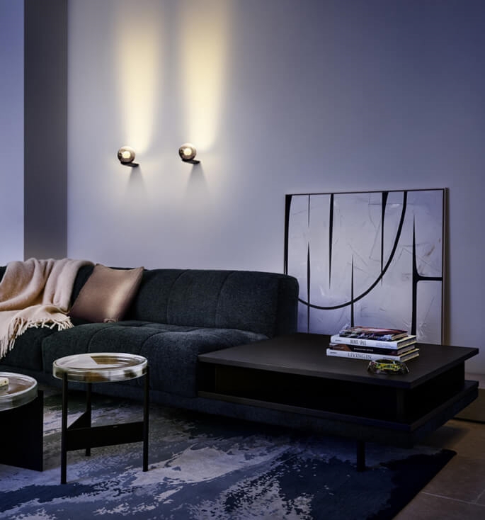 Occhio Luna Parete verwandelt Ihre Wand in ein Kunstwerk aus Licht. Die verspiegelte Glaskugel reflektiert das Occhio Fireball-Licht an Wand und Decke und schafft eine harmonische, weiche und stimmungsvolle Beleuchtung, die den Raum mit Ruhe und Magie erfüllt. Die metallische PVD-Beschichtung der Lampe verleiht einen eleganten Glanz, während die Lichtquelle wie ein aufgehender Mond schwebt und die Umgebung subtil und dynamisch hervorhebt.