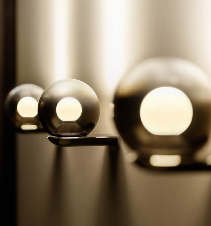 Occhio Luna Parete verwandelt Ihre Wand in ein Kunstwerk aus Licht. Die verspiegelte Glaskugel reflektiert das Occhio Fireball-Licht an Wand und Decke und schafft eine harmonische, sanfte und stimmungsvolle Beleuchtung, die den Raum mit Ruhe und Magie erfüllt. Die metallische PVD-Beschichtung der Lampe verleiht einen eleganten Glanz, während die Lichtquelle wie ein aufgehender Mond schwebt und die Umgebung subtil und dynamisch hervorhebt.