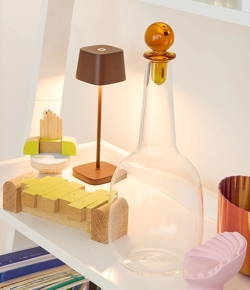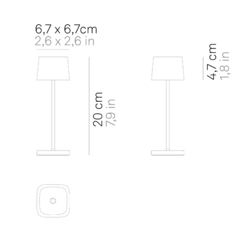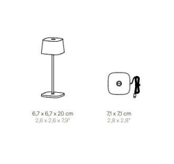 Die Batterielampe Ofelia micro ist eine kleinere Version der beliebten tragbaren Tischlampe Ofelia. Die kleine wiederaufladbare Lampe ist aus druckgegossenem Aluminium gefertigt und kann dank ihrer IP65-Klassifizierung sowohl drinnen als auch draußen verwendet werden. Die Batterielampe ist leicht mitzunehmen und kann in der Helligkeit gedimmt werden, sodass das Licht über eine Touch-Funktion oben am Schirm an die gewünschte Stimmung angepasst werden kann. Hier wird auch die Farbtemperatur von entweder 2200K, 2700K oder 3000K gewählt. Eine Speicherfunktion kann die Einstellungen speichern, wenn die Lampe wieder eingeschaltet wird.