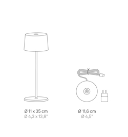 Olivia ist aus Druckguss-Aluminium gefertigt und in verschiedenen Ausführungen erhältlich, von denen die meisten sowohl für den Innen- als auch für den Außenbereich geeignet sind. Die Variante in Antikgold wird nicht für den dauerhaften Außeneinsatz empfohlen. Alle Varianten müssen im Innenbereich aufgeladen werden.