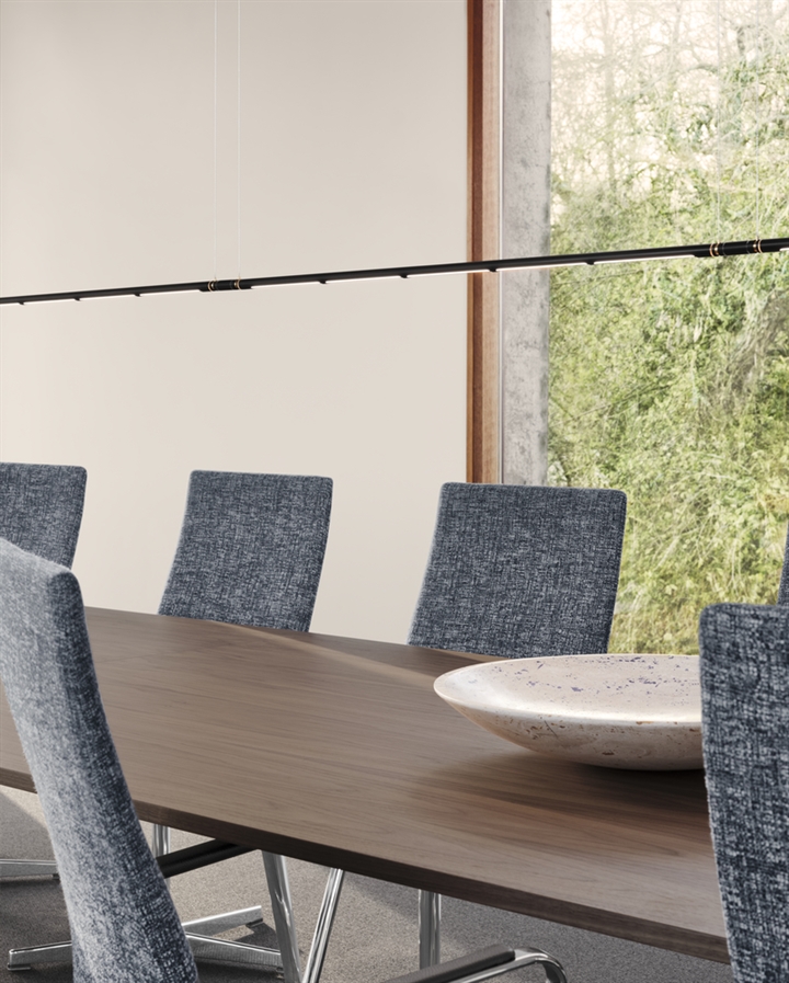 Oneline ist inspiriert von den klaren Formen im Möbeldesign von Poul Kjærholm. Die einzigartige Pendelleuchte ist in Edelstahl, gebürstetem Messing oder in schwarzem PVD erhältlich. Die Lampe und die Lichtquelle können um 360 Grad gedreht werden und erscheinen mit ihren stromführenden Drähten kabellos und schwebend in der Luft.