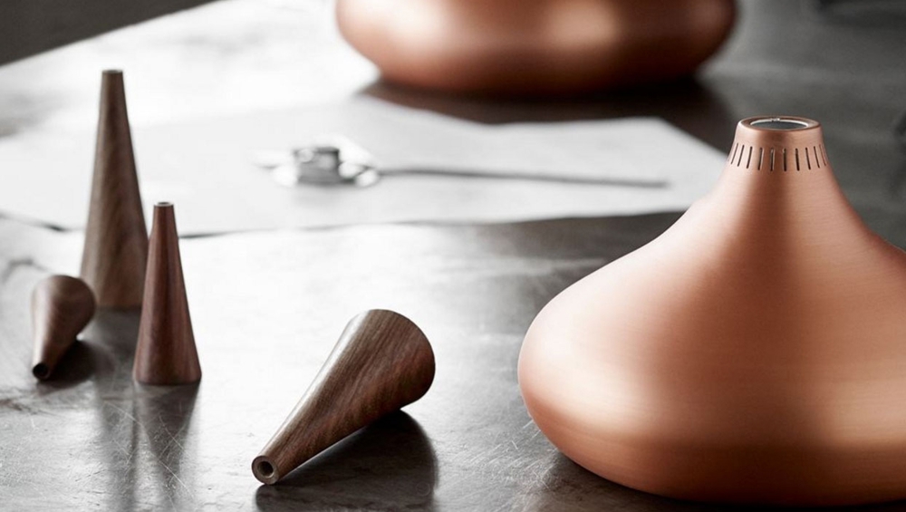 Die klassische Pendelleuchte erstrahlt völlig originalgetreu in zwei Größen Ø225 und Ø340 mm. Die organische Formensprache verbindet die tiefe, lebendige Kupferglut mit der Spitze aus Rosenholz. Aus den dunklen Adern des Rosenholzes entsteht eine natürliche Verbindung zum schwarzen, dicht gewebten Textilkabel. Die Lampe hat 21/24 schmale, vertikale Schlitze in der Oberseite des echten Kupferschirms, die Licht austreten lassen. Das Gehäuse verbirgt elegant die energiesparende Lichtquelle und sorgt für ein angenehmes, blendfreies Licht.