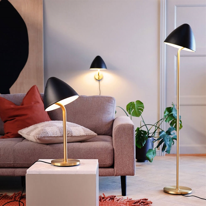Oulu ist sowohl als Wandleuchte, Stehleuchte als auch Tischleuchte in den Kombinationen schwarz/messing und schwarz/gebürsteter Stahl erhältlich.