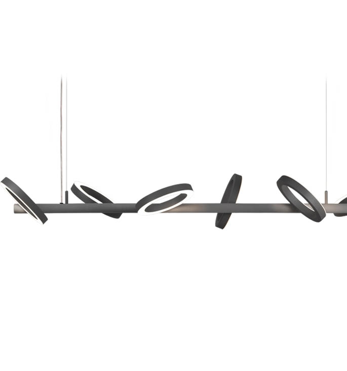 Die schöne und elegante Pallana Pendelleuchte hat ein anpassungsfähiges Design und besteht aus 6 Ringen, die ein attraktives, kreisförmiges Licht erzeugen. Die Schirme sind verstellbar und können sich stufenlos in alle Richtungen drehen. Die Ringlichter lassen sich zudem drehen, sodass das Licht sowohl nach oben als auch nach unten strahlen und gezielt als Arbeitslicht ausgerichtet werden kann.