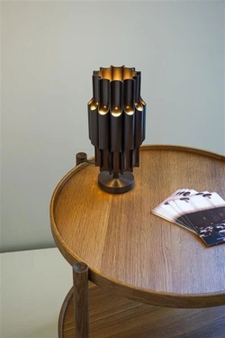 Die Tischleuchte Pan 120 ist ein schönes und dekoratives Design von Bent Karlby, inspiriert von der Panflöte. Das Design besteht aus glänzenden Leuchtröhren aus eloxiertem Aluminium mit Bronze-Finish, das gut zu vielen modernen Einrichtungen passt.