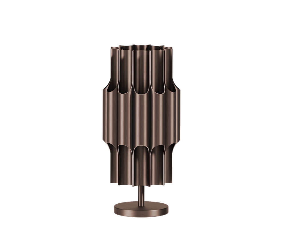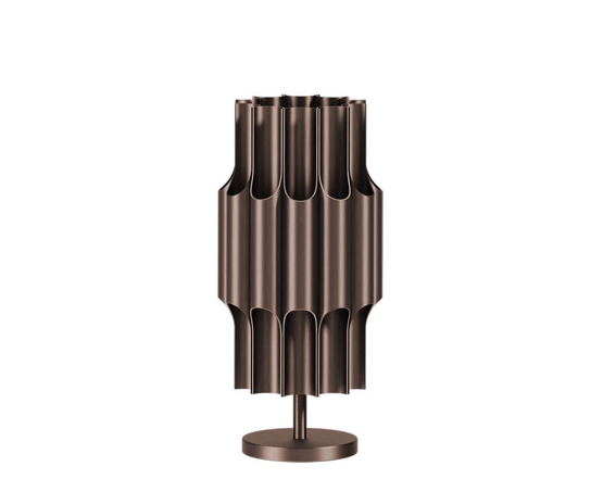 Die Tischleuchte Pan 190 ist ein schönes und dekoratives Design von Bent Karlby, inspiriert von der Panflöte. Das Design besteht aus glänzenden Leuchtröhren aus eloxiertem Aluminium mit Bronze-Finish, das gut zu vielen modernen Einrichtungen passt.