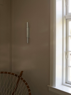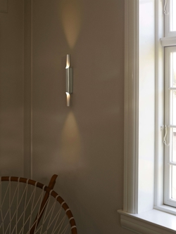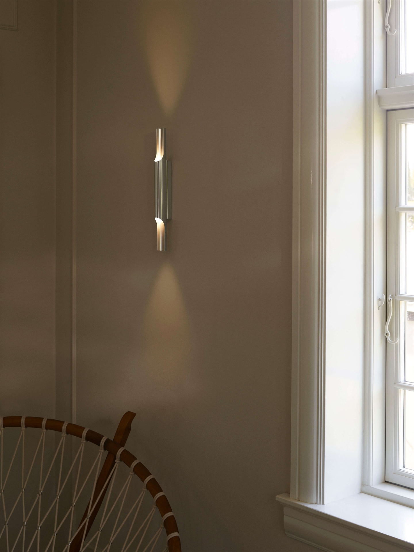 Die Wandleuchte Pan 38 ist ein schönes und dekoratives Design von Bent Karlby, inspiriert von der Panflöte. Die Lampe erzeugt ein schönes Lichtspiel an der Wand durch die Öffnungen oben und unten im glänzenden Leuchtrohr aus eloxiertem Aluminium. Die zwei Lichtquellen sorgen für ein gleichmäßiges, weiches Licht von oben und unten.