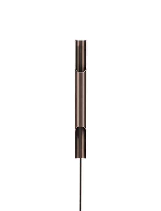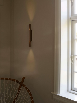 Die Wandleuchte Pan 38 ist ein schönes und dekoratives Design von Bent Karlby, inspiriert von der Panflöte. Die Leuchte erzeugt ein schönes Lichtspiel an der Wand durch die Öffnungen oben und unten des glänzenden Leuchtrohrs aus eloxiertem Aluminium mit Bronze-Finish. Die zwei Lichtquellen sorgen für ein gleichmäßiges, weiches Licht von oben und unten.