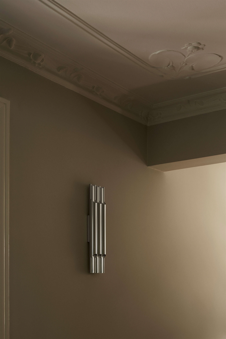 Die Wandleuchte Pan 50 III ist ein schönes und dekoratives Design von Bent Karlby, inspiriert von der Panflöte. Die Leuchte erzeugt ein schönes Lichtspiel an der Wand durch die Öffnungen oben und unten der drei glänzenden Leuchtröhren aus eloxiertem Aluminium. Die zwei Lichtquellen in jedem Leuchtröhr sorgen für ein gleichmäßiges, weiches Licht von oben und unten.