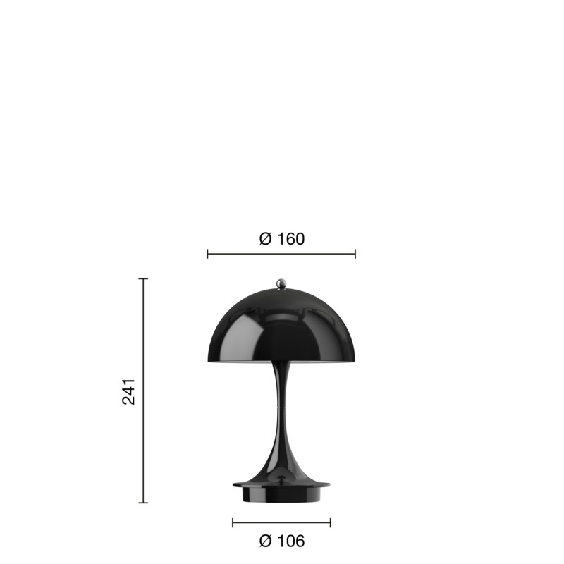 Diese Panthella hat eine Basis und einen undurchsichtigen Schirm in Schwarz. Es handelt sich um das V3-Modell der Panthella 160 Portable, das 2024 auf den Markt gebracht wurde. Im Vergleich zu früheren Modellen wurde das V3-Modell unter anderem mit längerer Batterielaufzeit verbessert und die Lichtsteuerung ist in den Knopf oben am Schirm integriert, wo die Dimm- und Ein-/Ausschaltfunktion früher an der Basis war.