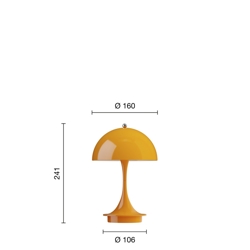 Diese Panthella hat eine Basis und einen undurchsichtigen Schirm in Orange. Es ist das V3-Modell der Panthella 160 Portable, das 2024 auf den Markt kommt. Im Vergleich zu früheren Modellen wurde das V3-Modell unter anderem mit längerer Akkulaufzeit verbessert und die Lichtsteuerung ist in den Knopf oben am Schirm integriert, wo die Dimm- und Ein-/Ausschaltfunktion früher an der Basis war.