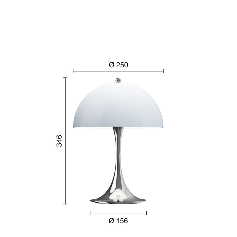 Diese Panthella hat eine Basis in Chrom und einen Schirm in blaugrauem Opal. Es ist das V3-Modell der Panthella 250 Portable, das 2025 auf den Markt kommt. Im Vergleich zu früheren Modellen wurde das V3-Modell unter anderem mit längerer Akkulaufzeit und einer Funktion verbessert, die den Akku schützt, wenn man die Lampe benutzt, während sie an die Steckdose angeschlossen ist. Außerdem hat das neue Modell die Ein-/Ausschaltfunktion in den Knopf oben auf dem Schirm integriert, wo sie zuvor an der Basis war.