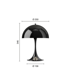 Diese Panthella hat eine Basis und einen undurchsichtigen Schirm in Schwarz. Es ist das V3-Modell der Panthella 250 Portable, das 2025 auf den Markt gebracht wurde. Im Vergleich zu früheren Modellen wurde das V3-Modell unter anderem mit längerer Batterielaufzeit und einer Funktion verbessert, die den Akku schützt, wenn man die Lampe benutzt, während sie an die Steckdose angeschlossen ist. Außerdem hat das neue Modell die Ein-/Ausschaltfunktion in den Knopf oben auf dem Schirm integriert, wo sie zuvor an der Basis war.