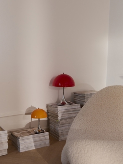Diese Panthella hat eine Basis aus Chrom und einen Schirm aus rotem Opal. Es handelt sich um das V3-Modell der Panthella 250 Portable, das 2025 auf den Markt gebracht wurde. Im Vergleich zu früheren Modellen wurde das V3-Modell unter anderem mit längerer Batterielaufzeit und einer Funktion verbessert, die das Batterie schützt, wenn die Lampe während des Anschlusses an die Steckdose verwendet wird. Darüber hinaus verfügt das neue Modell über eine Ein-/Ausschaltfunktion, die in den Knopf oben auf dem Schirm integriert ist, wo sie zuvor an der Basis war.