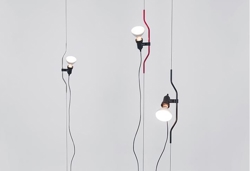 Parentesi ist eine einzigartige Boden-Decken-Leuchte, bei der die Lampe an einem 4 m langen Stahlkabel montiert ist.