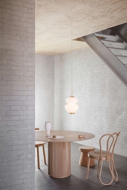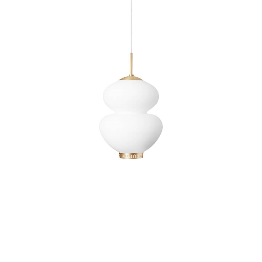 Der dezente Schirm schafft es, einen sanften Ausdruck im Raum zu erzeugen und harmoniert wunderbar mit den runden Formen und der Erdnussform der Lampe. Die Pendelleuchte ist ansprechend anzusehen und verleiht durch die Messingdetails einen eleganten und einfachen Auftritt sowie einen warmen Ausdruck.
