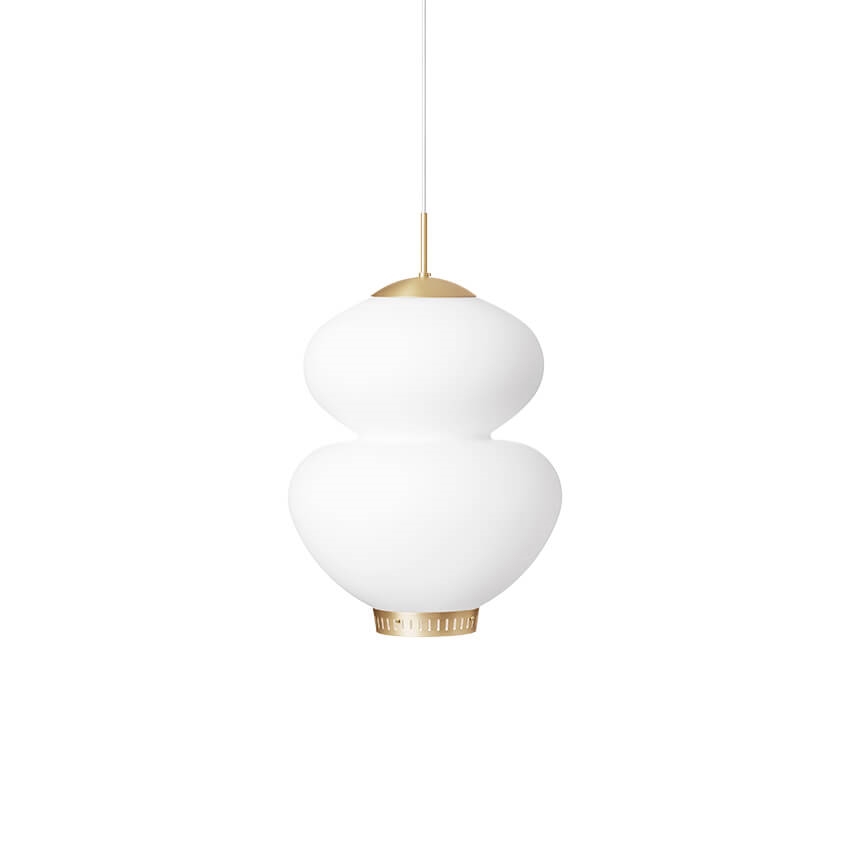 Der dezente Schirm schafft es, einen sanften Ausdruck im Raum zu erzeugen und harmoniert wunderbar mit den runden Formen und der Erdnussform der Lampe. Die Pendelleuchte ist ansprechend anzusehen und verleiht durch die Messingdetails ein elegantes und einfaches Erscheinungsbild sowie einen warmen Ausdruck.