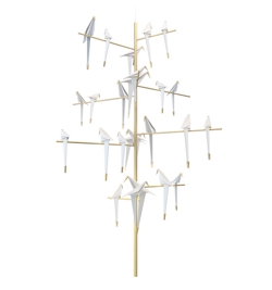 Perch Light Tree besteht aus 25 abstrakten Vögeln, die auf Ästen verteilt sind und dem Raum ein fantastisches Leuchten und eine besondere Atmosphäre verleihen. Wenn man die Vögel leicht berührt, können sie schwingen, was ihnen noch mehr Leben verleiht