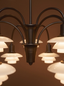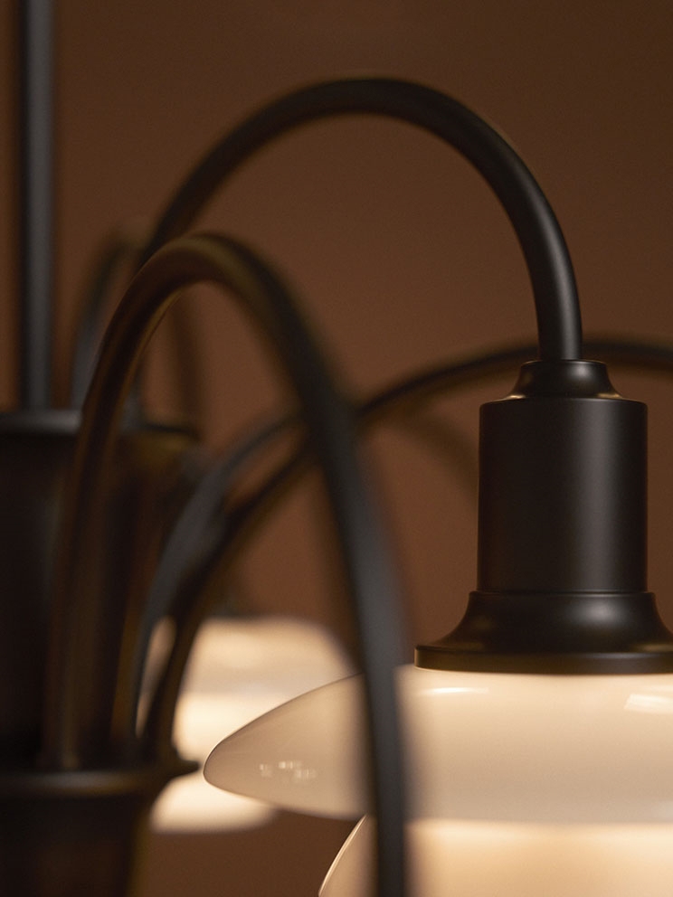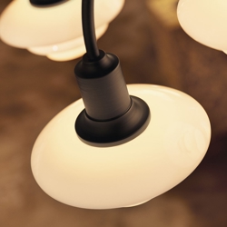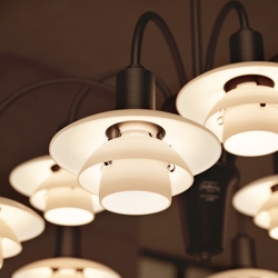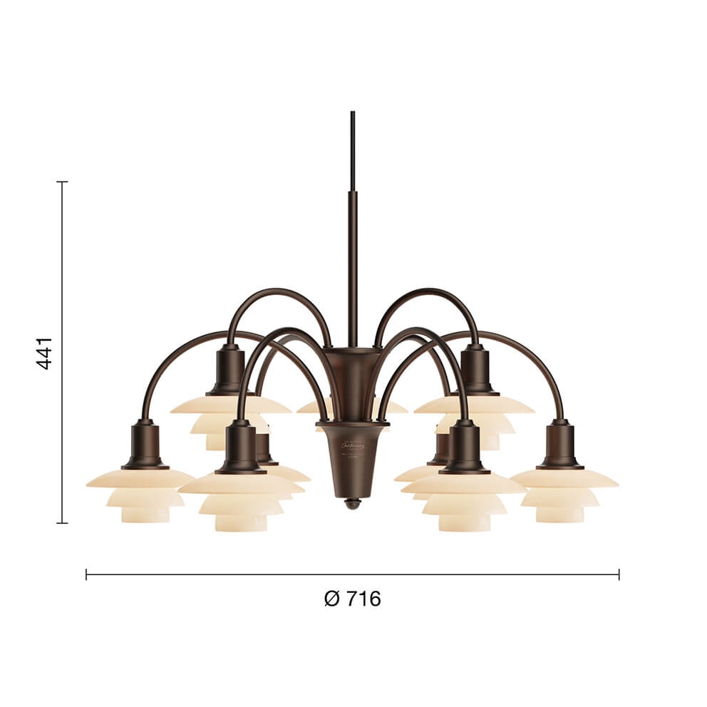 Die PH-Leuchtennummer bezieht sich auf die Größe der Lampenschirme. PH 1/1 ist das kleinste Schirmset im System PH und hat einen oberen Schirm von ca. 16 cm. Die Kronleuchter der PH Centenary Edition sind Louis Poulsens erste Wiedereinführung des Schirmsets.