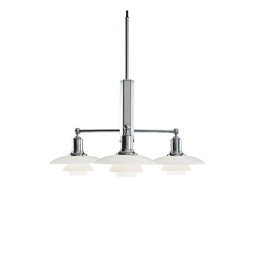 Bei dieser PH 2/1 Stammekrone erhalten Sie drei der einzigartigen PH 2/1 Pendelleuchten in einem Gestell aus hochglanzverchromtem Messing.