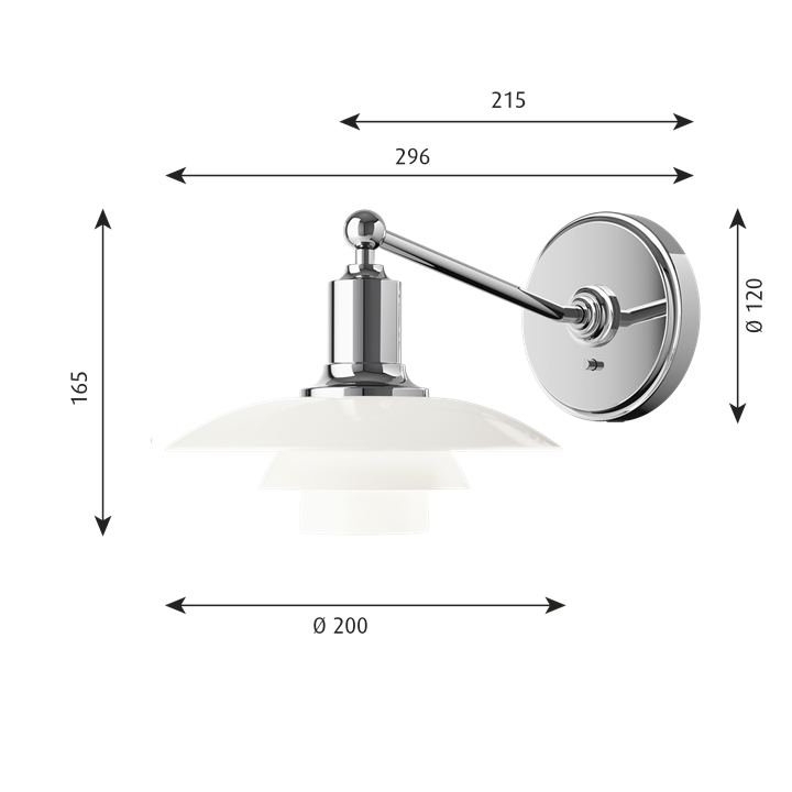 Die PH-Lampennummer bezieht sich auf die Größe der Lampenschirme. Daher besteht die Wandleuchte aus einem Oberschirm von ca. 20 cm und Unterschirmen aus der 1/1 Version.