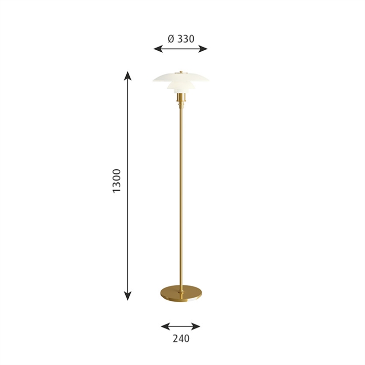 Die außergewöhnliche PH 3½-2½ Stehleuchte bietet ein weiches und harmonisches Licht aus dem mundgeblasenen weißen Opalglas in drei Schichten, das das Licht hauptsächlich nach unten lenkt. Die PH 3½-2½ Stehleuchte basiert auf dem ikonischen Dreischirmsystem von Poul Henningsen aus dem Jahr 1925, das für eine fantastische blendfreie Lichtverteilung sorgt. Die einzigartige Stehleuchte ist unglaublich vielseitig und passt sowohl in klassische als auch in moderne Einrichtungen.