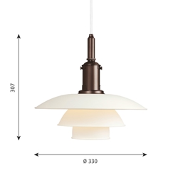 Die PH-Lampennummer bezieht sich auf die Größe der Lampenschirme. Daher besteht die PH 3½-3 Pendel aus einem Oberschirm von ca. 35 cm und Unterschirmen aus der 3/3 Version.