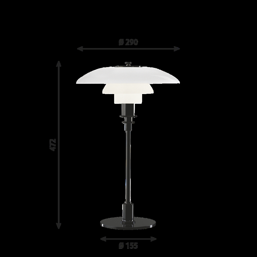 Die PH-Lampennummer bezieht sich auf die Größe der Lampenschirme. Daher besteht die PH 3/2 Tischleuchte aus einem oberen Schirm von ca. 30 cm und unteren Schirmen aus der 2/2-Version.