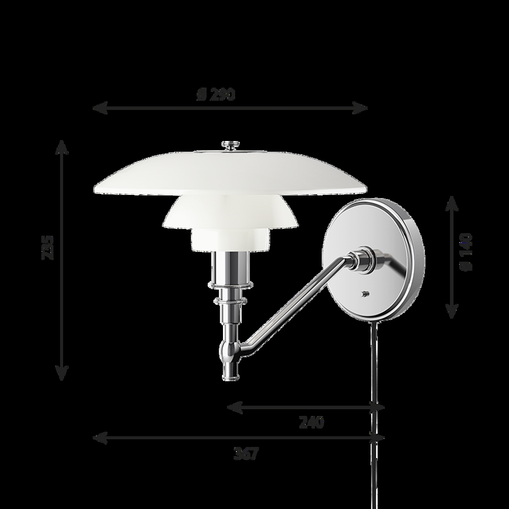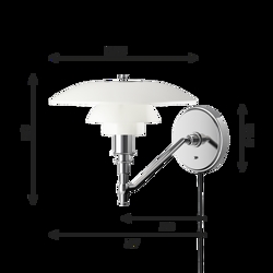 Diese Variante der PH 3/2 Wandleuchte ist mit Kabel. Der Arm der Wandleuchte ist aus hochglanzverchromtem Messing, und die Halterung ist aus hochglanzverchromtem gezogenem Messing.