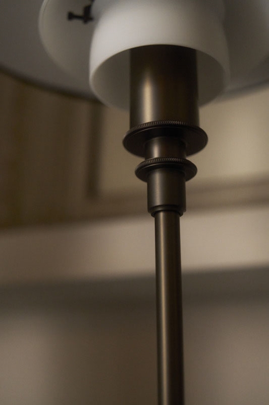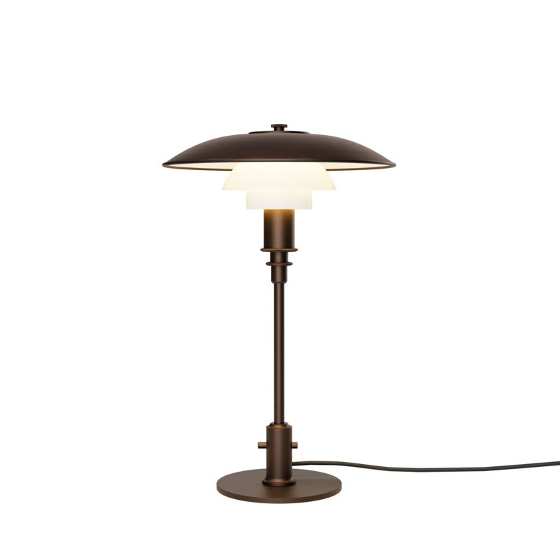 Die PH-Lampennummer bezieht sich auf die Größe der Lampenschirme. Daher besteht die PH 3/2 Tischleuchte aus einem Oberschirm von ca. 30 cm und Unterschirmen aus der 2/2-Version. Der obere Schirm der Aged Brass-Variante der PH 3/2 Tischleuchte ist wie der Sockel und der Stiel aus brüniertem Messing und hat eine weiß lackierte Unterseite, während die anderen beiden Schirme aus mundgeblasenem, dreischichtigem Opalglas mit glänzender Oberseite und sandgestrahlter, matter Unterseite bestehen. Zusammen sorgen die Schirme für ein weiches und harmonisches, stimmungsvolles Licht.