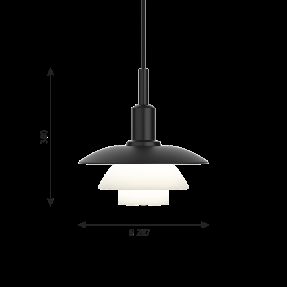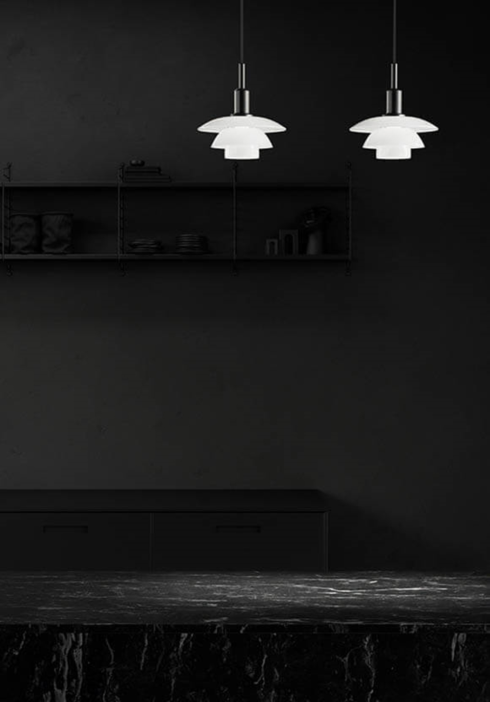 Die einzigartige PH 3/3 Pendelleuchte sorgt für ein weiches und harmonisches Licht durch den einen matt schwarz lackierten und die zwei opalen Glasschirme, die drei Schichten bilden und das Licht hauptsächlich nach unten lenken. PH 3/3 ist auf Basis von Poul Henningsens ikonischem Dreischirmsystem von 1926 entworfen, das für eine fantastische blendfreie Lichtverteilung sorgt.
