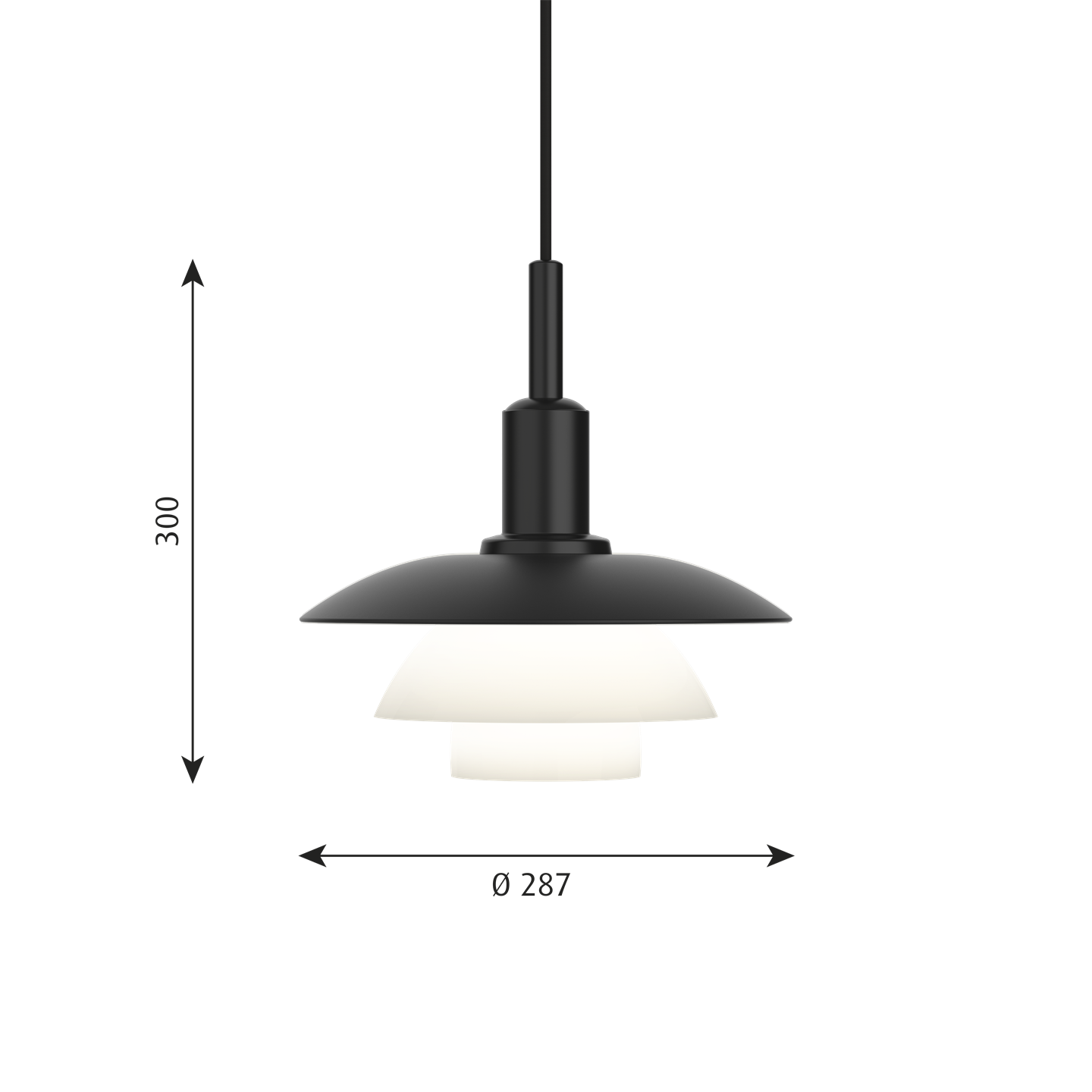 PH 3/3 hat eine Fassung aus mattschwarz pulverbeschichtetem, gegossenem Zink. PH 3/3 Pendelleuchte ist auch mit komplett weißen, opalen Glasschirmen oder mit komplett mattschwarzen Metallschirmen erhältlich.