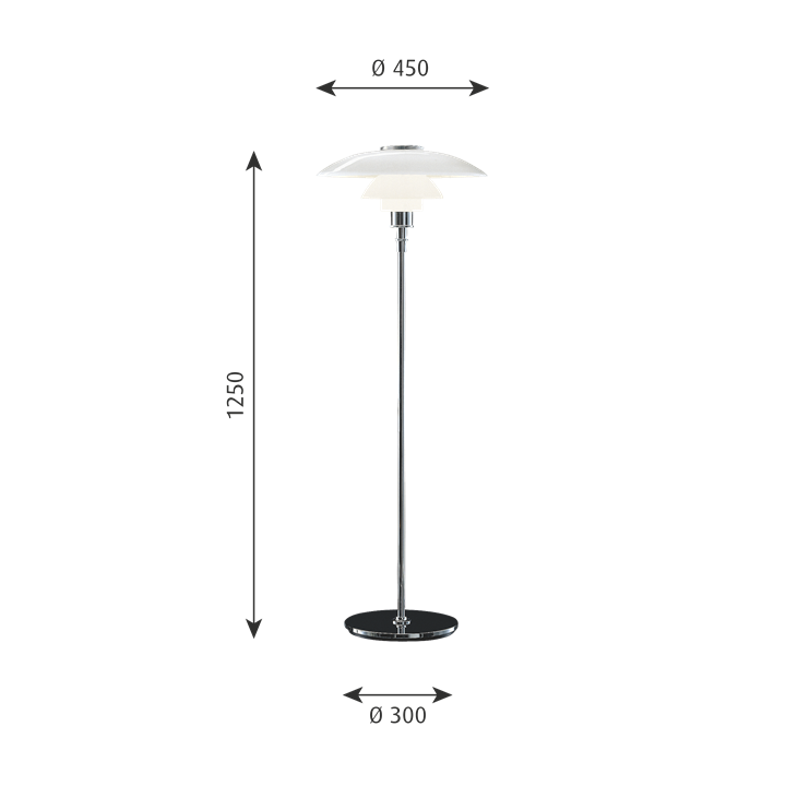 Die PH-Lampennummer bezieht sich auf die Größe der Lampenschirme. Daher besteht die PH 4½-3½ Stehleuchte aus einem Oberschirm von ca. 45 cm und Unterschirmen aus der 3½ Version.