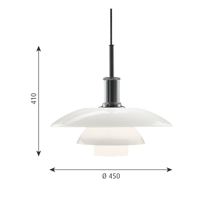 Die PH-Lampennummer bezieht sich auf die Größe der Lampenschirme. Daher besteht die 4½-4 Pendelleuchte aus einem Oberschirm von ca. 45 cm und Unterschirmen aus der 4/4 Version.