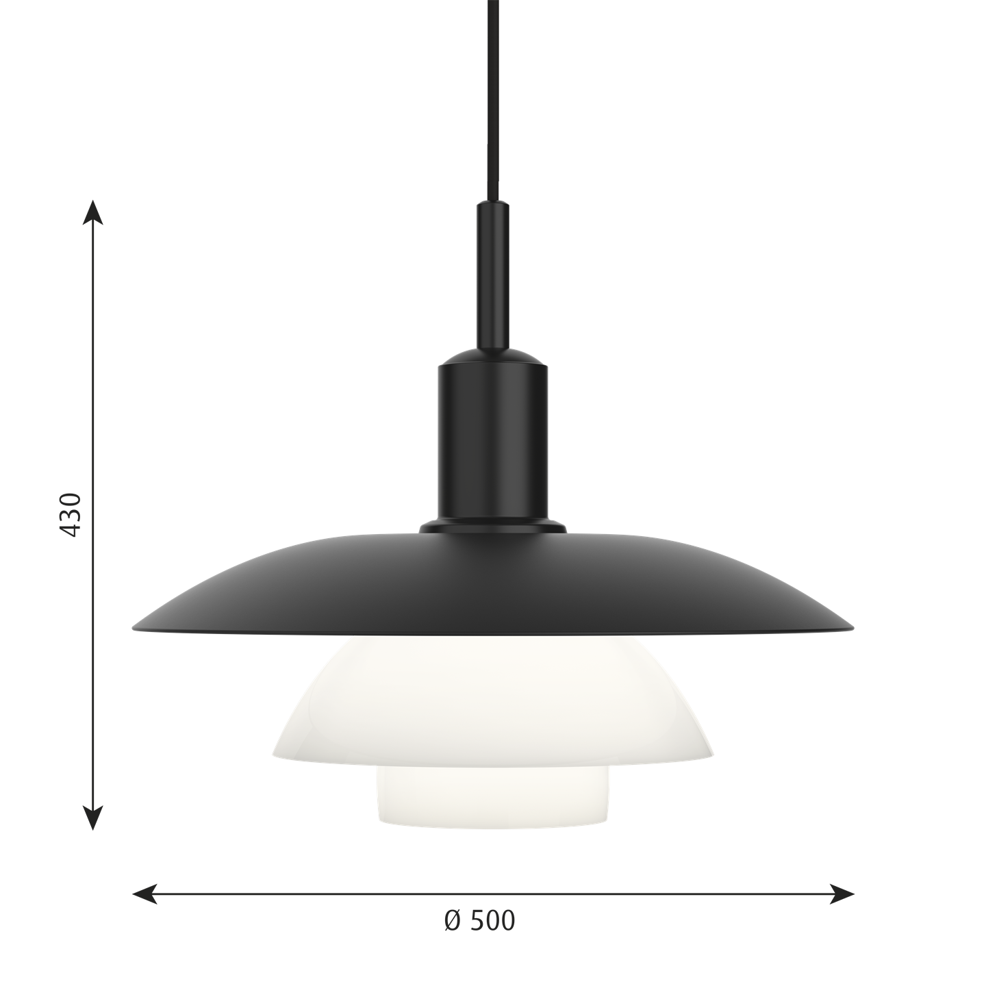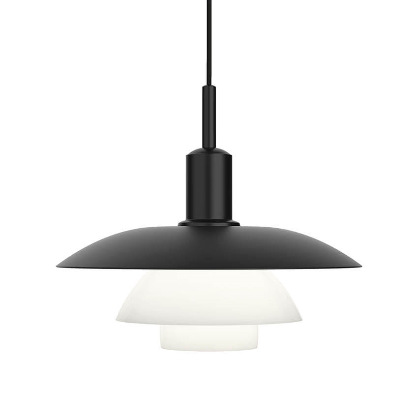 Die außergewöhnliche PH 5/5 Pendelleuchte bietet ein weiches und harmonisches Licht von dem einen mattschwarz lackierten und den zwei opalen Glasschirmen, die drei Schichten bilden und das Licht hauptsächlich nach unten leiten.
