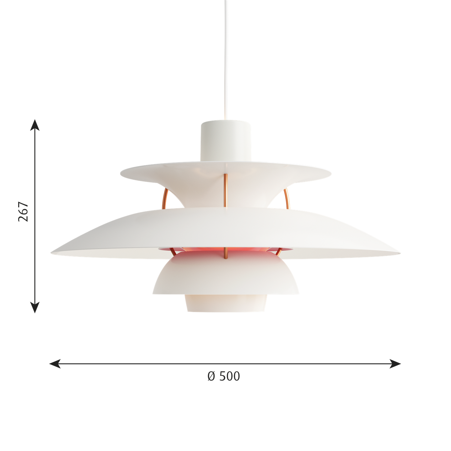 Die PH-Lampennummer bezieht sich auf die Größe der Lampenschirme. Daher besteht die PH 5 Pendel aus einem Oberschirm von ca. Ø50 cm.