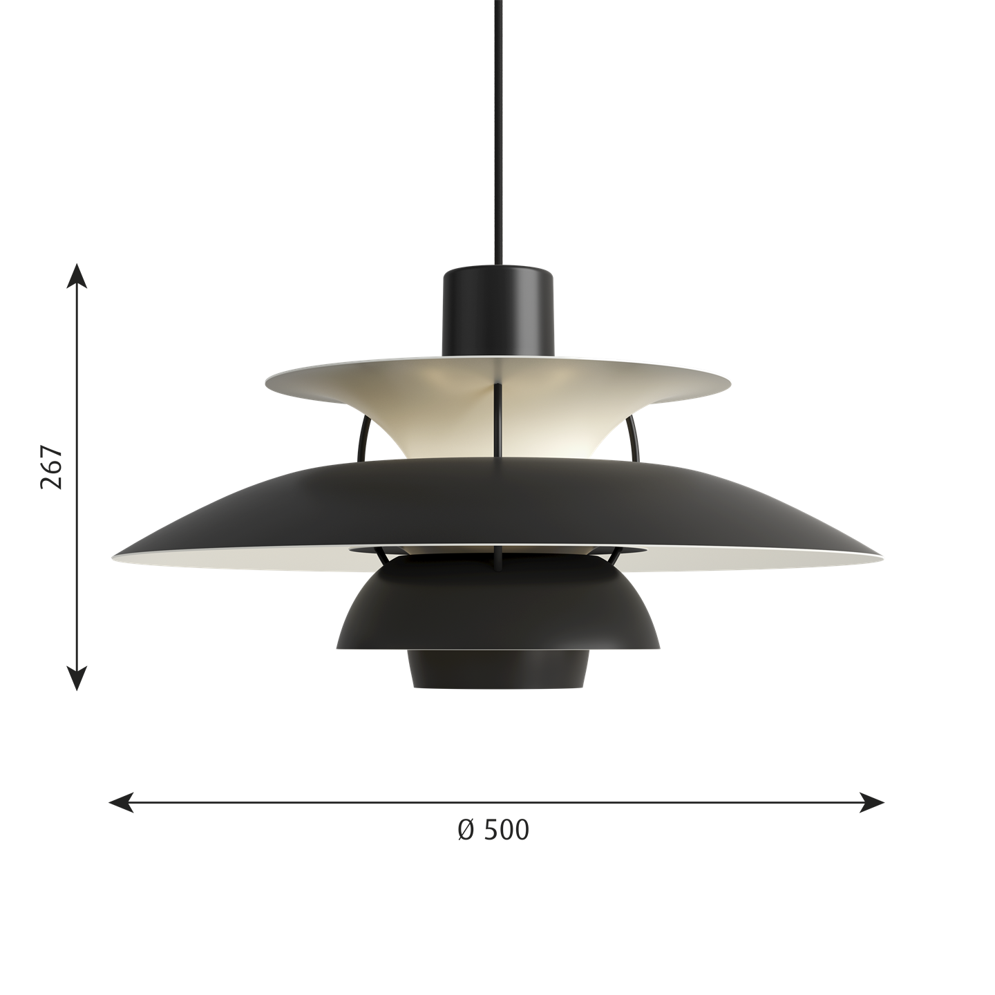 Die PH-Lampennummer bezieht sich auf die Größe der Lampenschirme. Daher besteht die PH 5 Pendelleuchte aus einem Oberschirm mit ca. Ø50 cm.