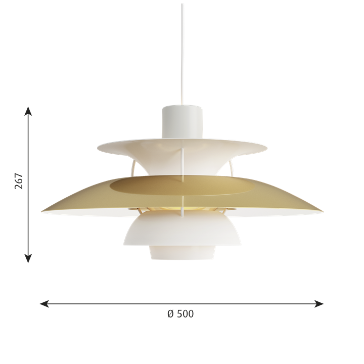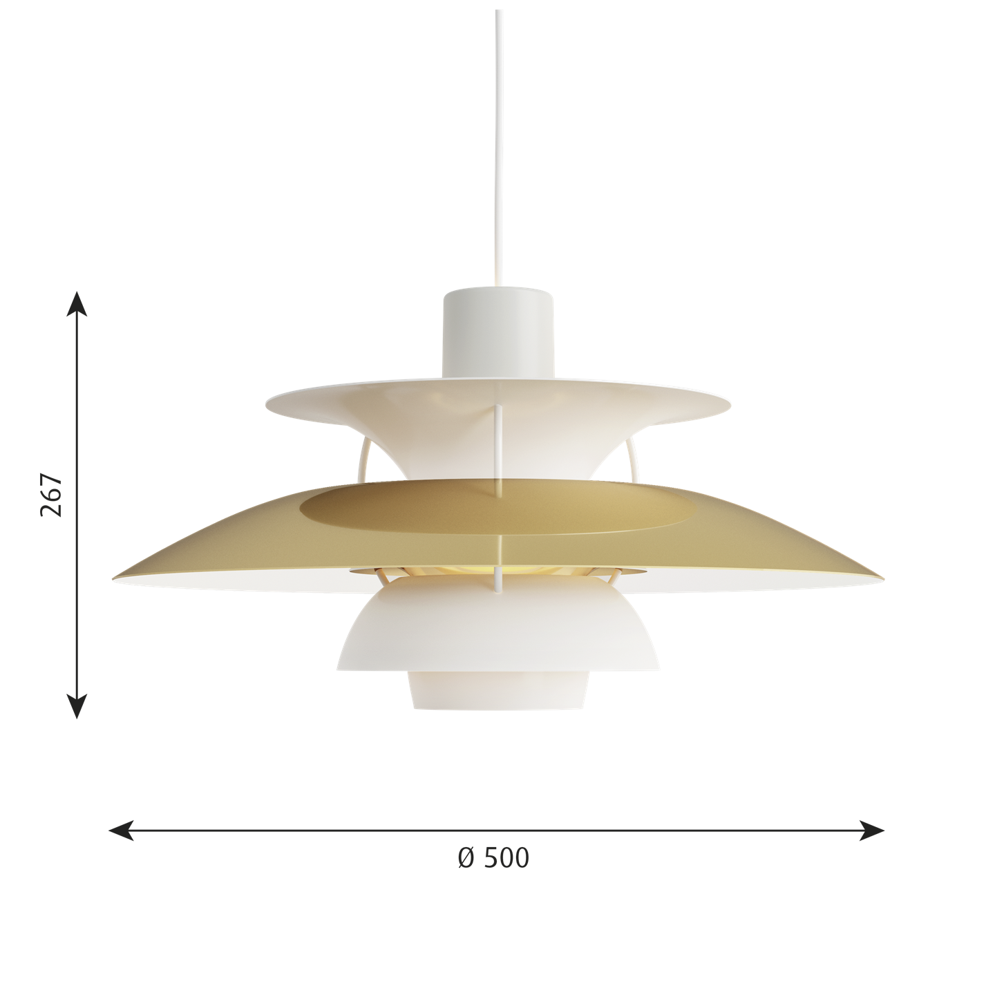 Die PH-Lampennummer bezieht sich auf die Größe der Lampenschirme. Daher besteht die PH 5 Pendelleuchte aus einem Oberschirm von ca. Ø50 cm.