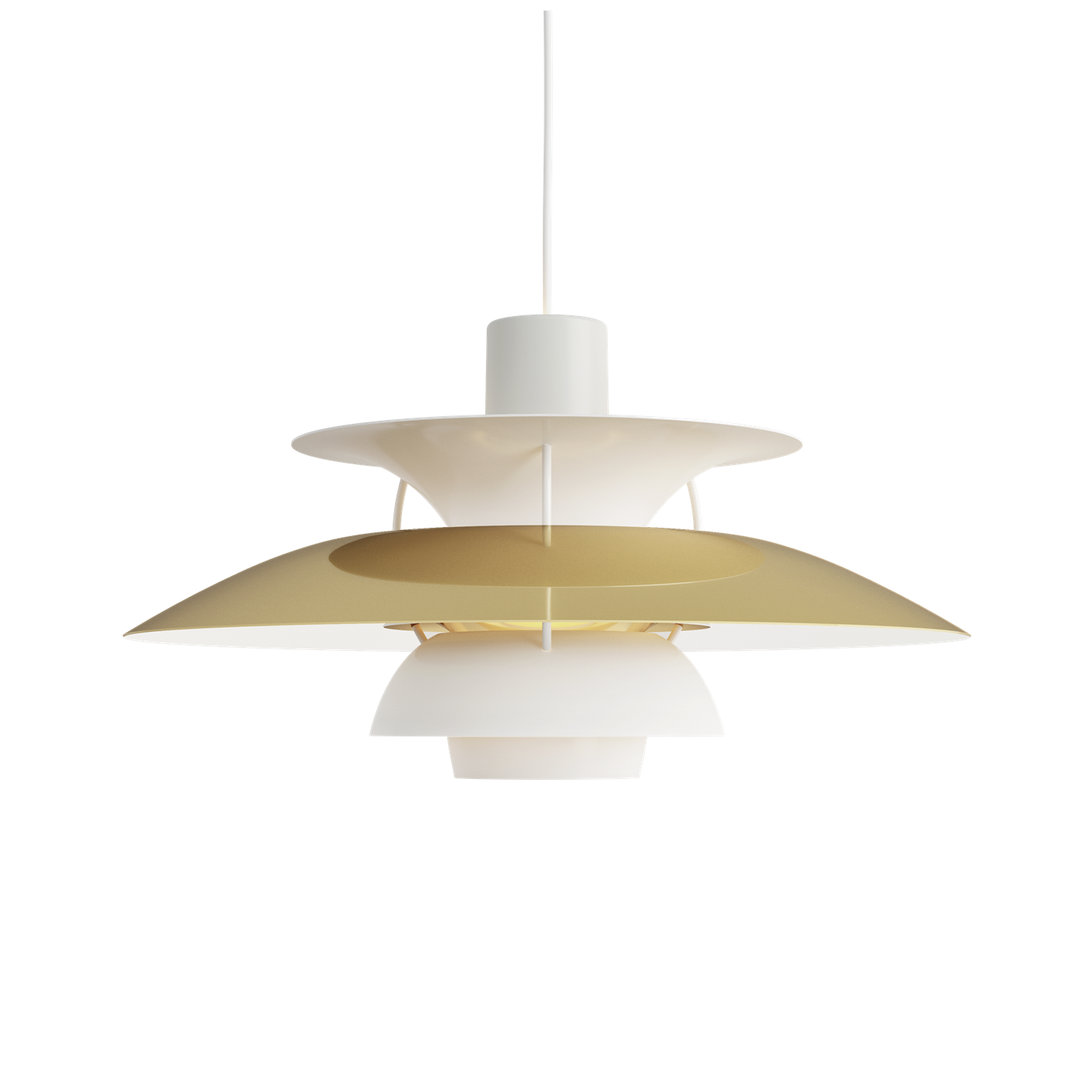 Die PH 5 Pendelleuchte ist mit Schirmen und Blendschirmen aus pulverbeschichtetem gezogenem Aluminium, gezogenem Kupfer oder gezogenem Messing erhältlich.