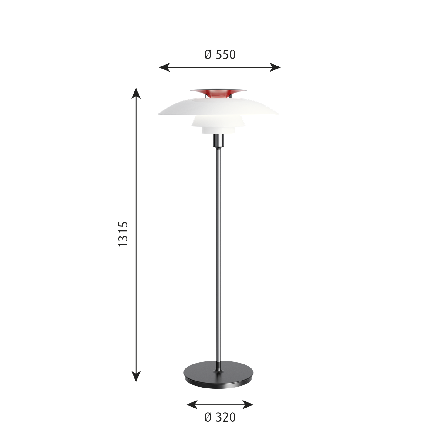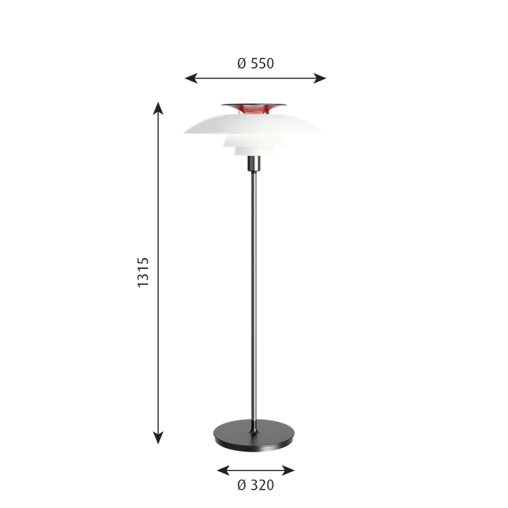 Die außergewöhnliche PH 80 Stehleuchte bietet ein weiches und harmonisches Licht aus den dreischichtigen opalen Acrylschirmen, die das Licht hauptsächlich nach unten leiten.