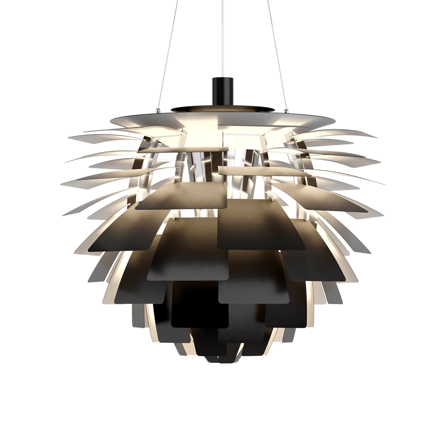 Die Blätter der PH Artichoke bestehen aus lasergeschnittenem Messing, Kupfer, Edelstahl oder Stahl mit einer Überdachung in Weiß oder Schwarz, gezogenem Stahl mit weißem Boden. Das Gestell ist aus hochglanzverchromtem lasergeschnittenem Stahl und die Aufhängung aus hochglanzverchromtem gezogenem Aluminium.