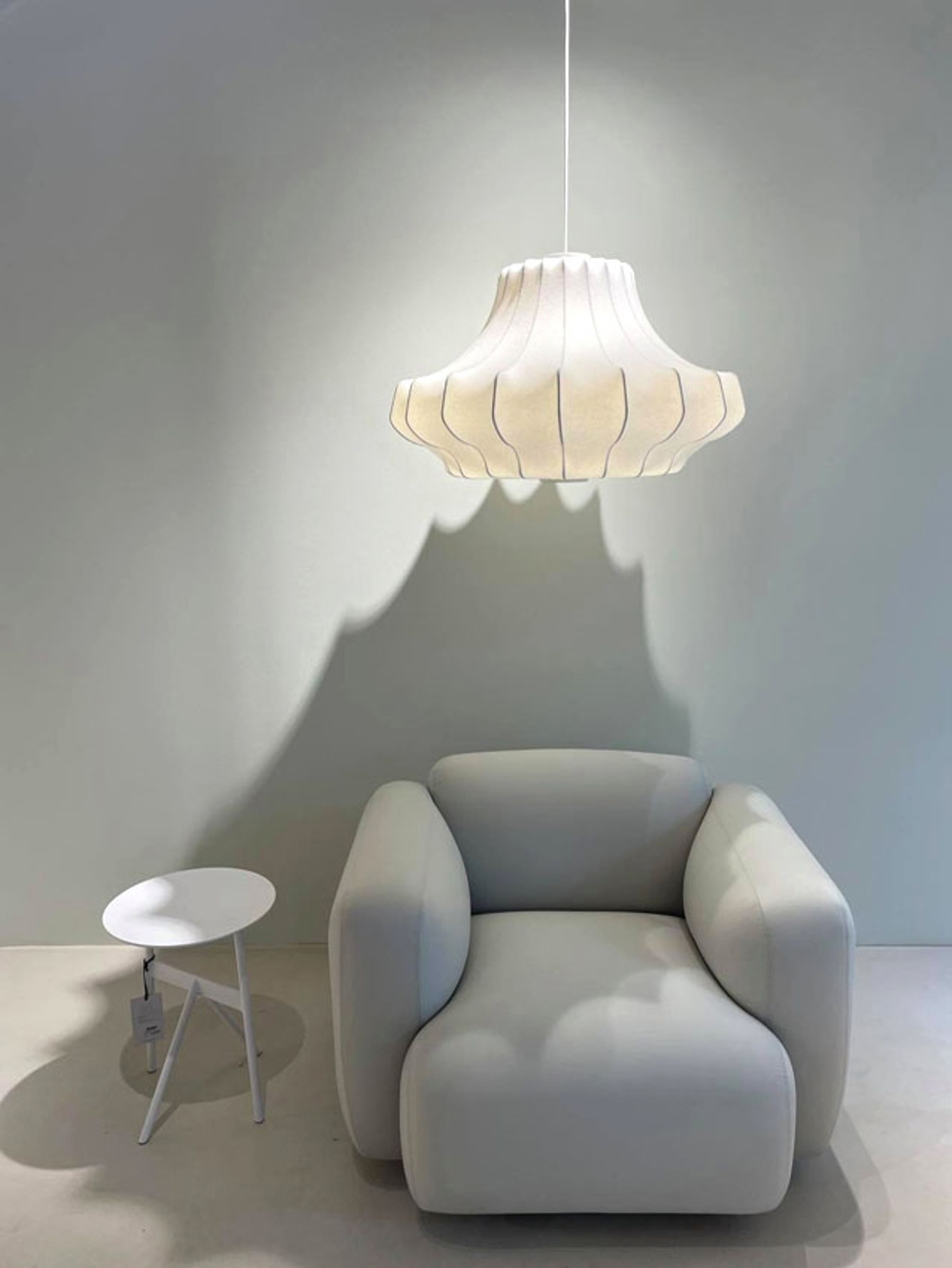 Die Lampe wird durch das Sprühen von dünnen Fäden aus flammhemmendem Harz auf einen Stahlrahmen hergestellt. Viele Schichten von Fäden vollenden den Lampenschirm, genau wie eine Seidenraupe ihren Kokon herstellt.