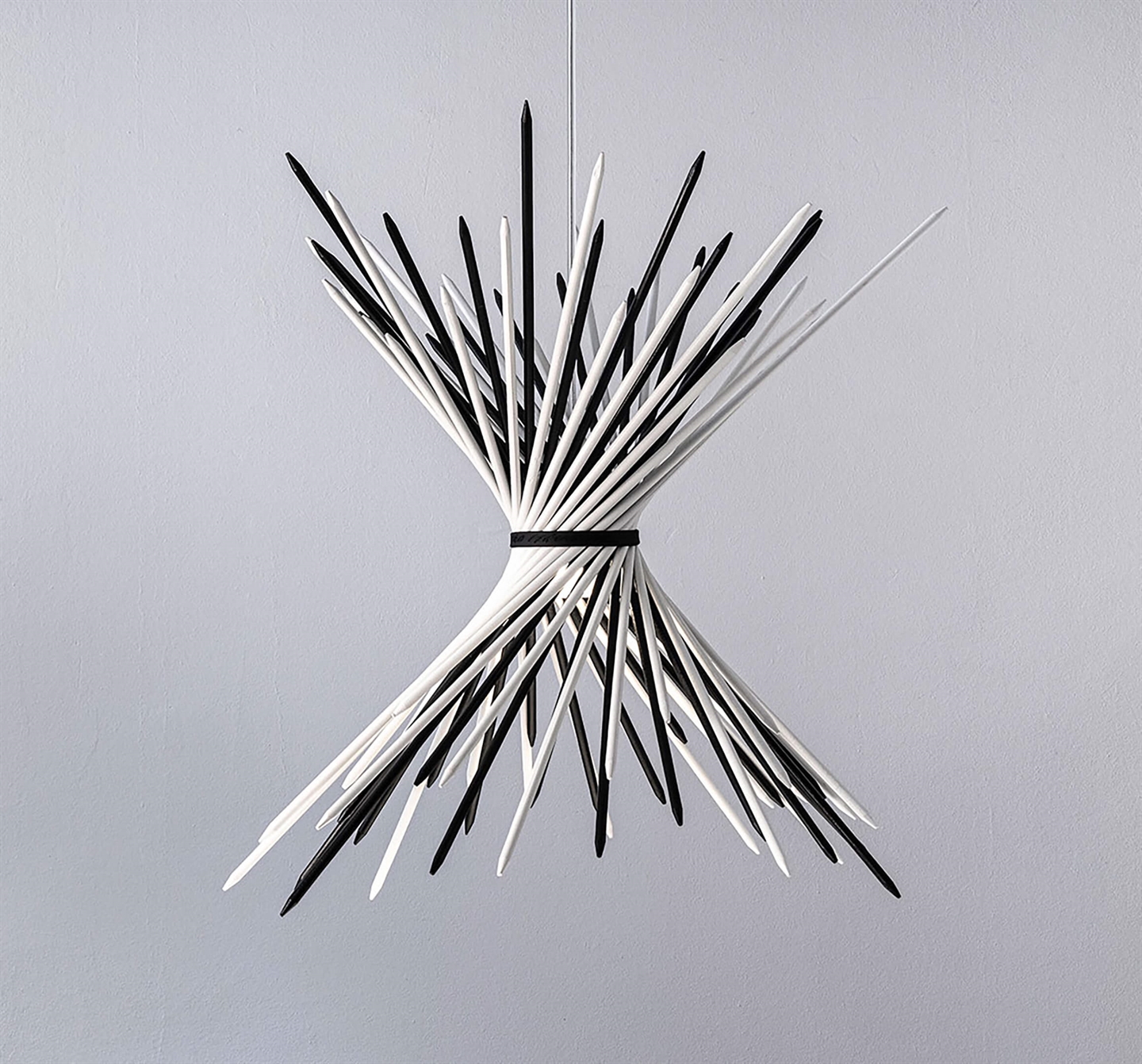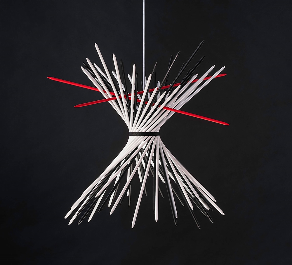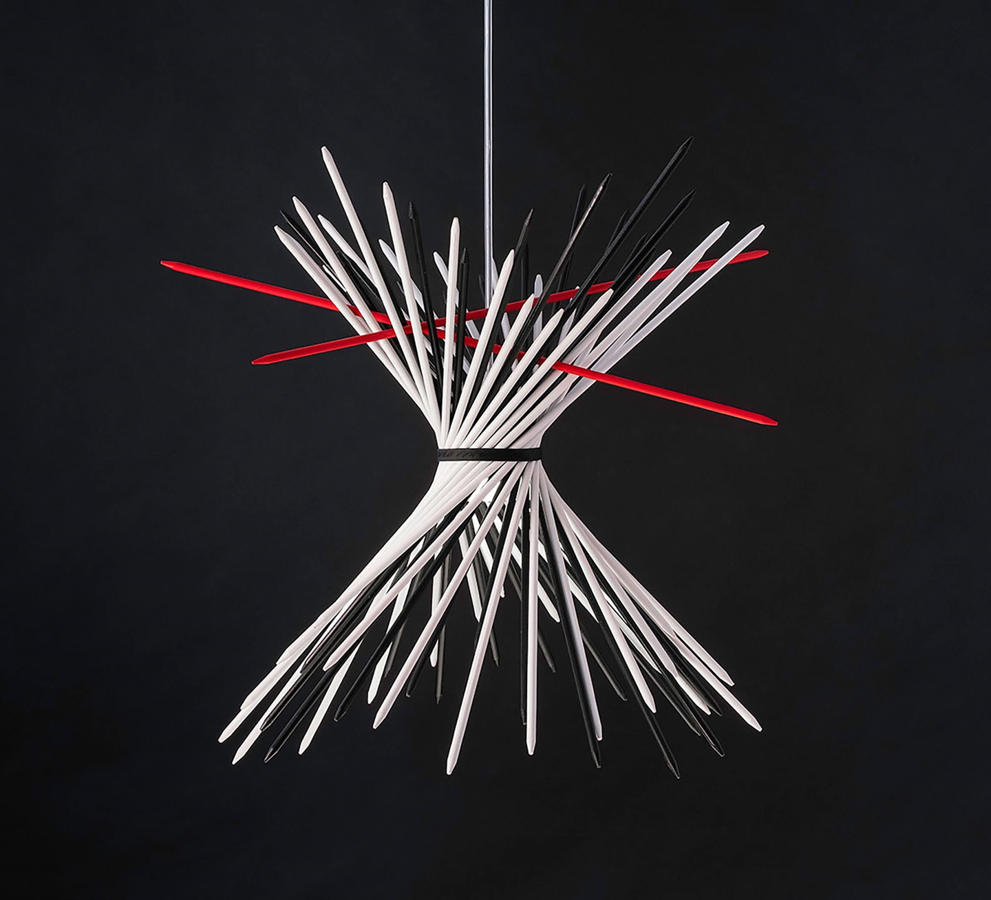 Die einzigartige Pic-a-stick Pendelleuchte besteht aus 50 lackierten Holzstäben und einem Gummiring, der die Stäbe in der Luft zusammenhält. Das außergewöhnliche Design ist vom Spiel "Mikado" inspiriert. Der Designer Andreas Walther wollte eine Pendelleuchte schaffen, die den Effekt nachbildet, der entsteht, wenn man die verschiedenen Stäbe im Spiel "Mikado" wirft.